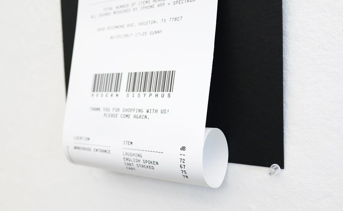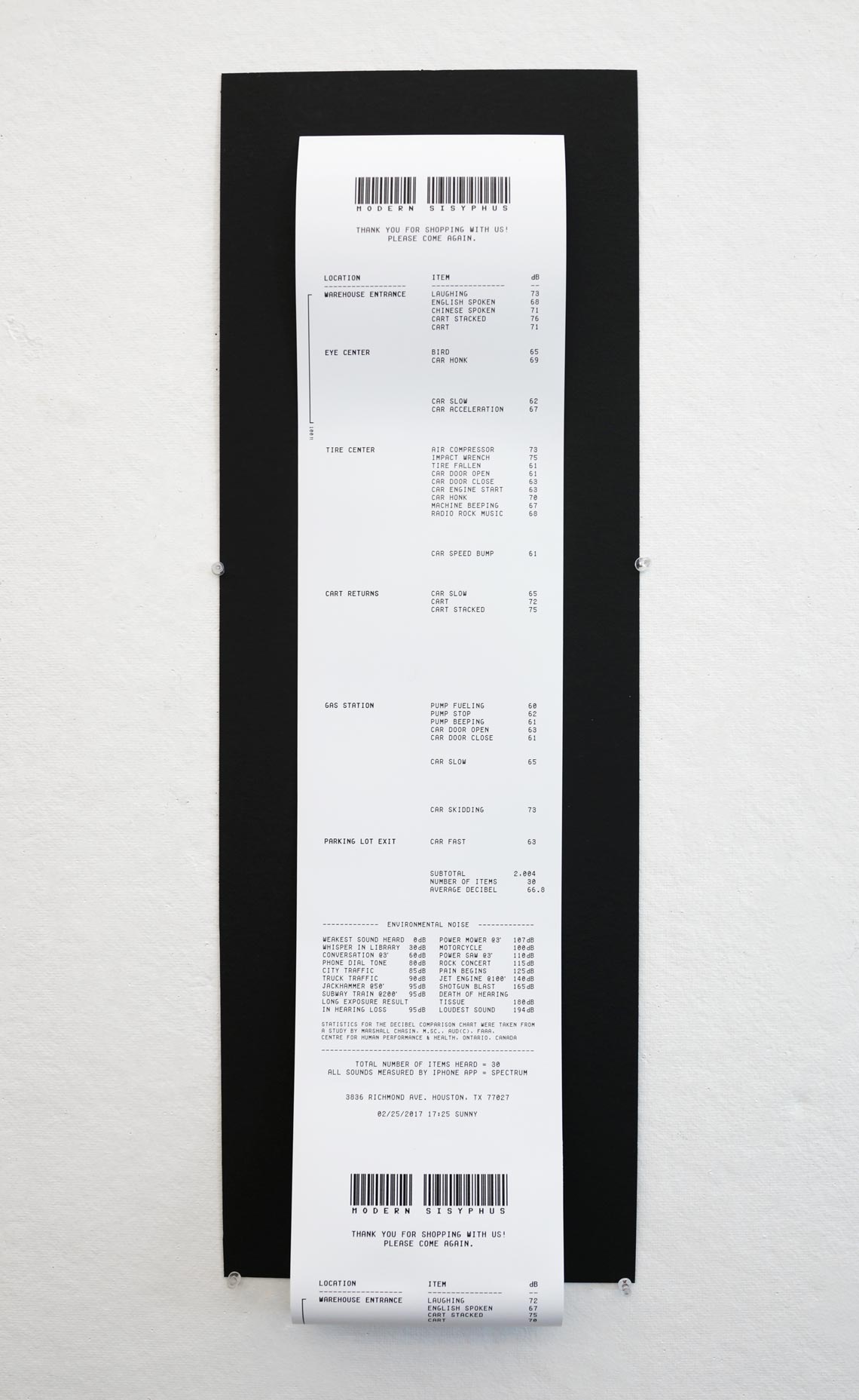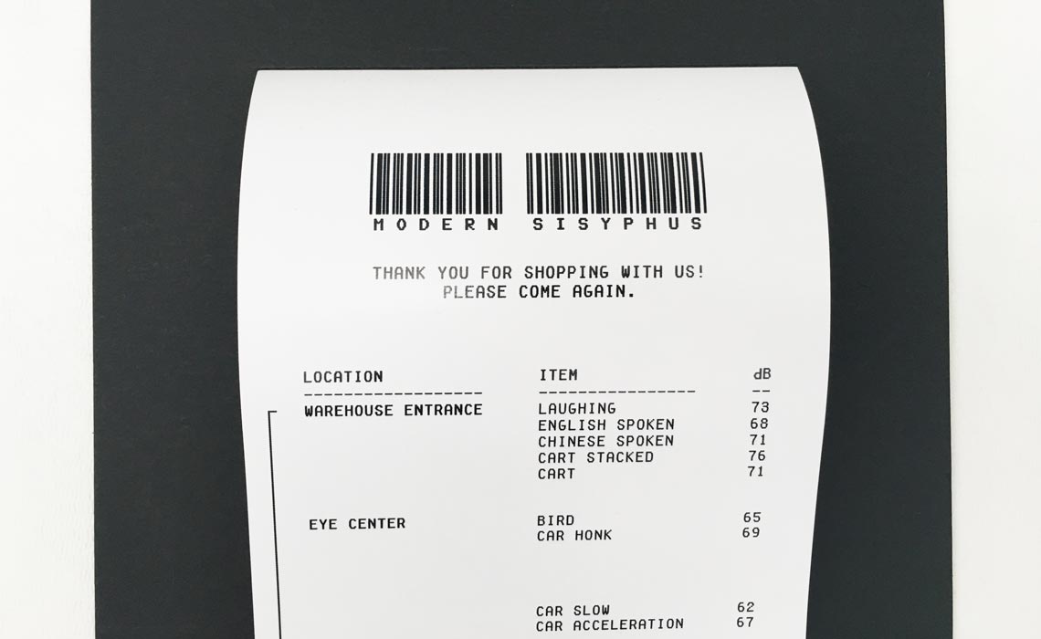 The Modern Sisyphus is a sound visualization project in the grocery store parking lot that borrows a receipt format. This project lets the audience realize that we push the shopping cart repeatedly as the punished Sisyphus eternally pushes the boulder up to the mountain in Greek Mythology and allows them to be aware of consumerism.