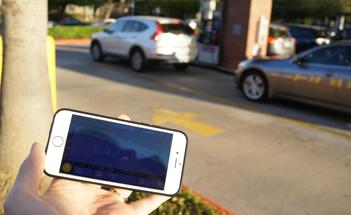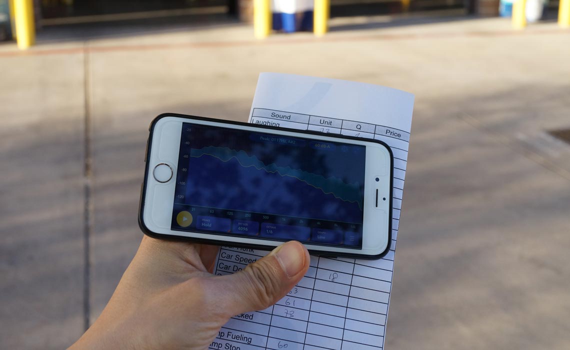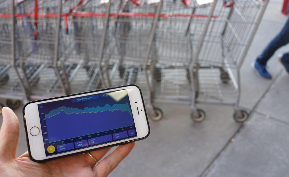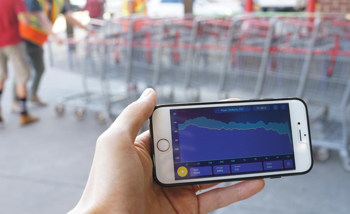 The dB meter application in the iPhone is utilized for recording and measuring sounds in the parking lot, and sounds are listed according to the distance from the main entrance of the store. Also, an additional receipt continues and rolls at the bottom of the art piece to enhance the idea of repetition.